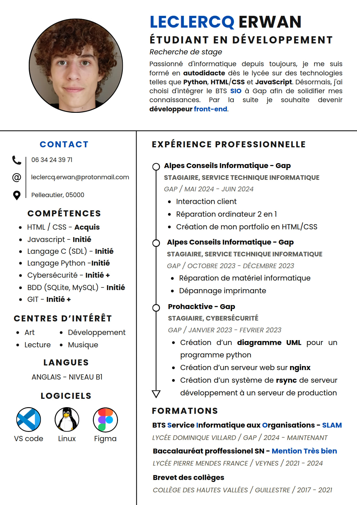 Je suis Erwan LECLERCQ, Passionné d'informatique depuis toujours, je me suis formé en autodidacte dès le lycée sur des technologies telles que Python, HTML/CSS et JavaScript. Désormais, j'ai choisi d'intégrer le BTS SIO à Gap afin de solidifier mes connaissances. Par la suite je souhaite devenir développeur front-end.